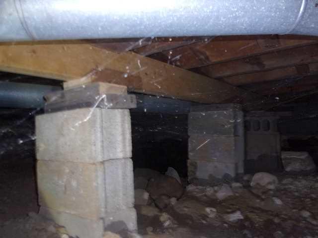 The discoloration on the blocks serving as crawl space supports is a sign of efflorescence. When water travels through the blocks, it dissolves salts contained within and then leaves them on the surface when it evaporates. It's a nuisance, but over time can cause problems as the constant dissolving of materials within the blocks can weaken them.